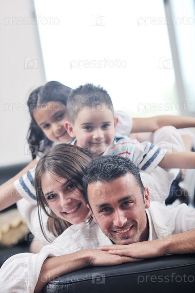 Счастливая молодая семья на диване в гостиной