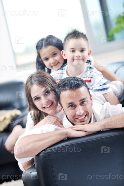 Счастливая молодая семья на диване в гостиной