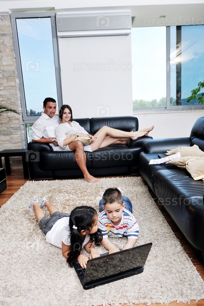 Молодые родители сидят на диване, дети лежат на полу с ноутбуком