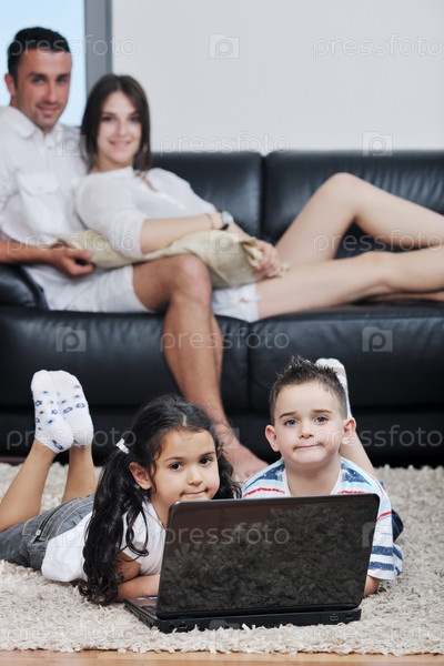 Молодые родители сидят на диване, дети лежат на полу с ноутбуком