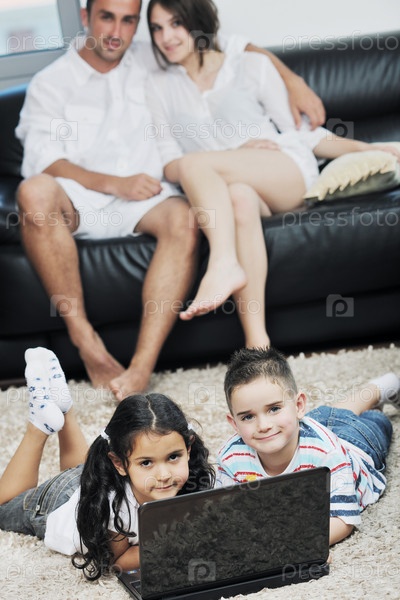 Молодые родители сидят на диване, дети лежат на полу с ноутбуком