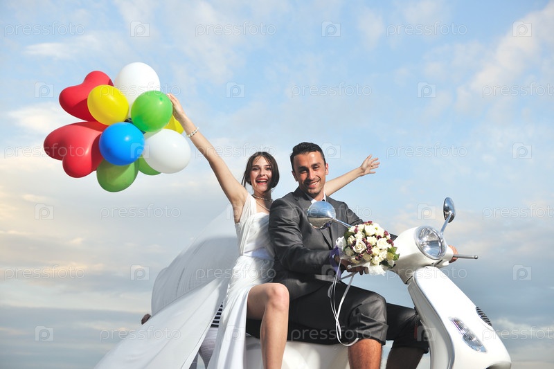 Счастливые молодожены на скутере