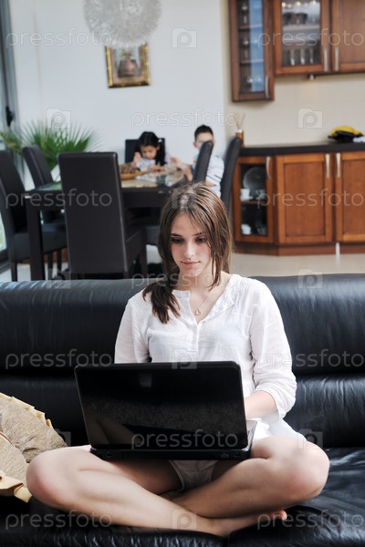 Молодая женщина сидит с ноутбуком на диване