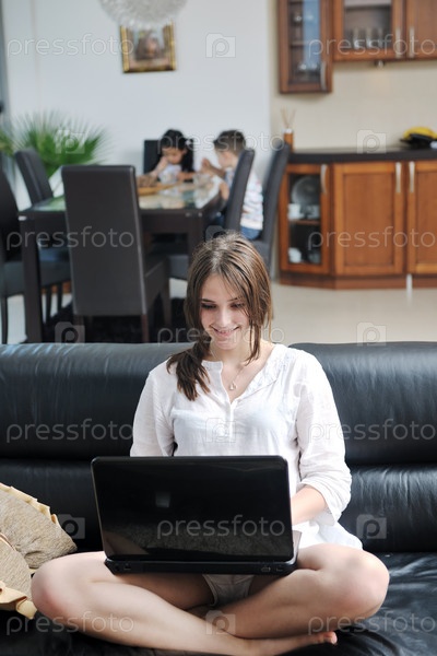 Молодая женщина сидит с ноутбуком на диване