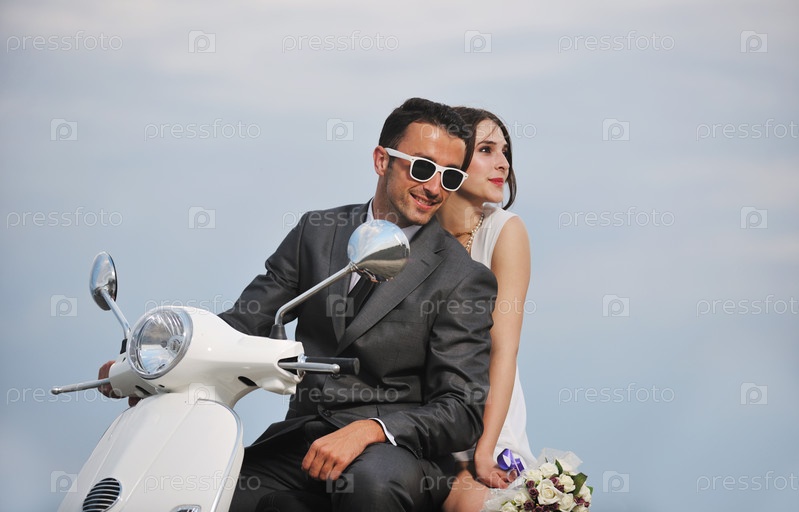 Счастливые молодожены на скутере