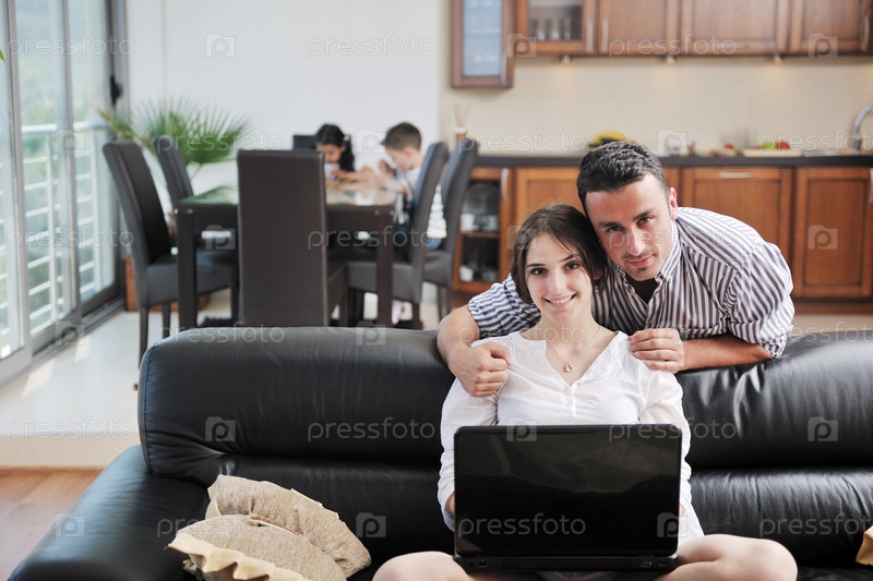 Молодая пара с ноутбуком в гостиной
