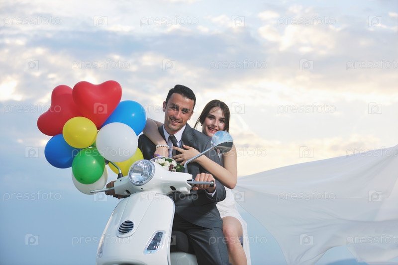 Счастливые молодожены на скутере
