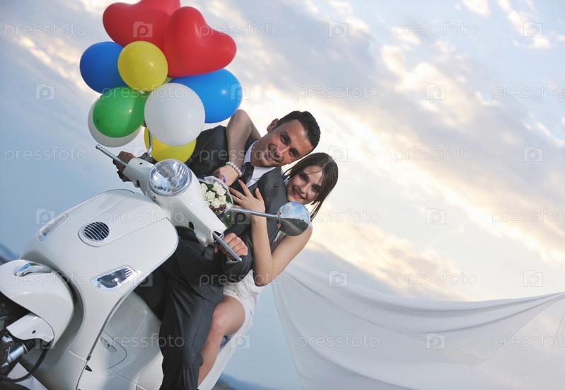 Счастливые молодожены на скутере