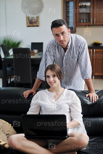Молодая пара с ноутбуком в гостиной