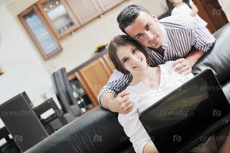 Молодая пара с ноутбуком в гостиной