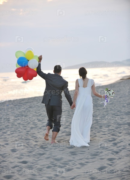 Счастливые молодожены на берегу моря
