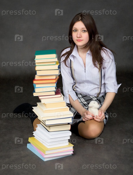 Девушка - школьница с кучей книг на черном фоне