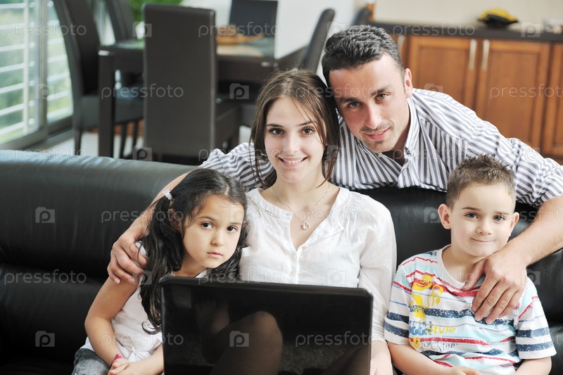 Счастливая молодая семья с ноутбуком в домашней обстановке