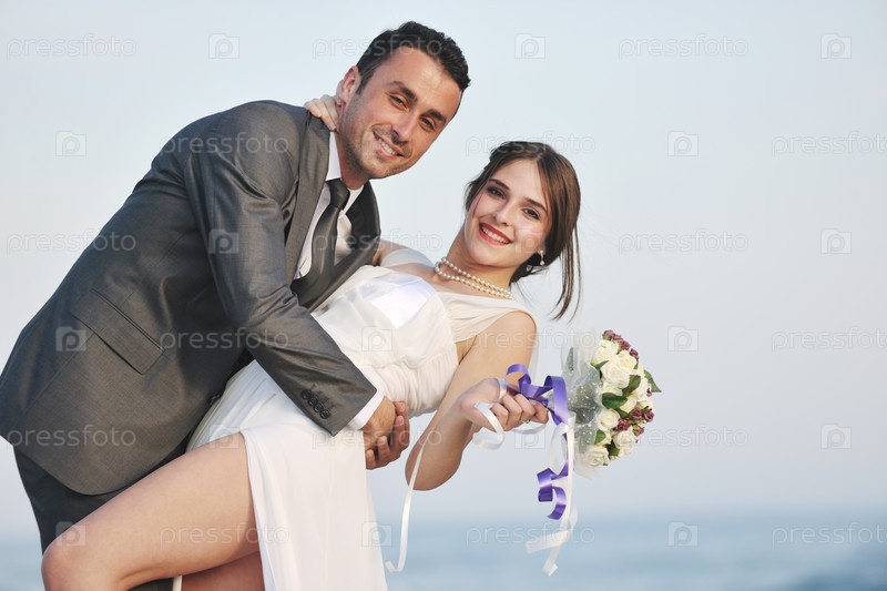Счастливые молодожены на берегу моря