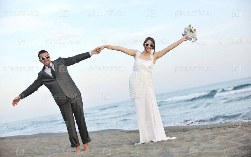 Счастливые молодожены на берегу моря