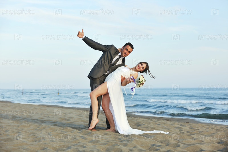 Счастливые молодожены на берегу моря