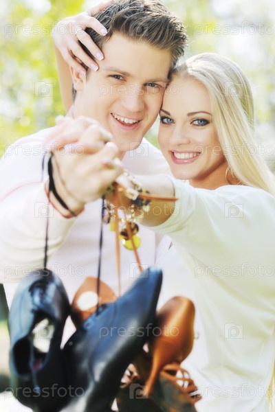 Счастливая пара с обувью в руках на открытом воздухе