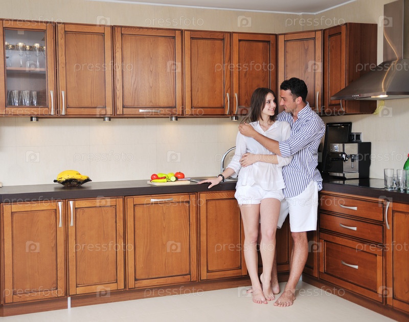 Счастливая молодая пара на современной кухне