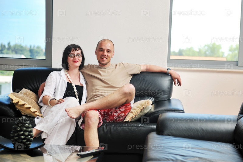 Молодая счастливая пара в современной гостиной