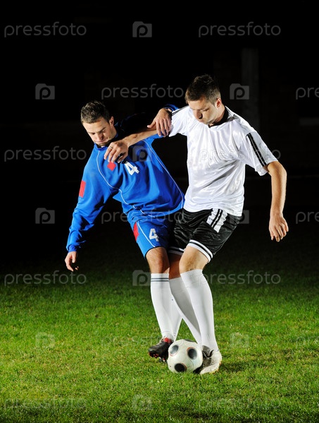 Футбольные игроки борются за мяч на поле