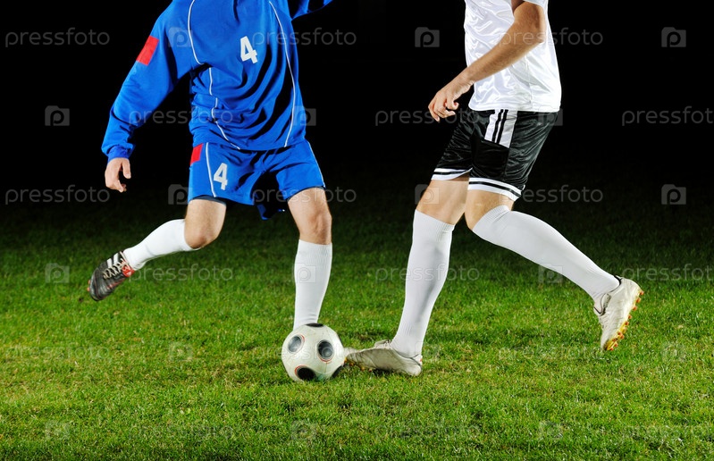 Футбольные игроки борются за мяч на поле