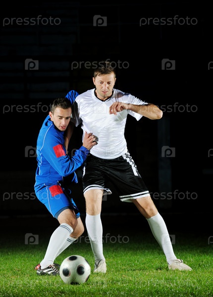 Футбольные игроки борются за мяч на поле
