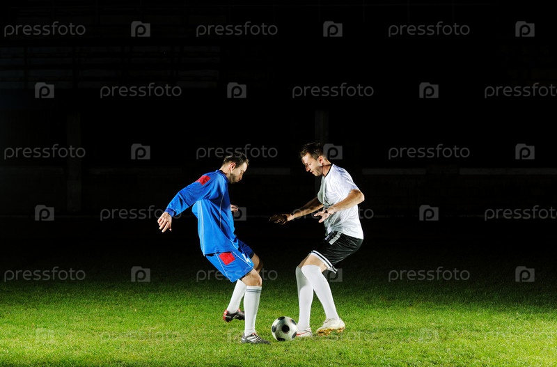 Футбольные игроки борются за мяч на поле