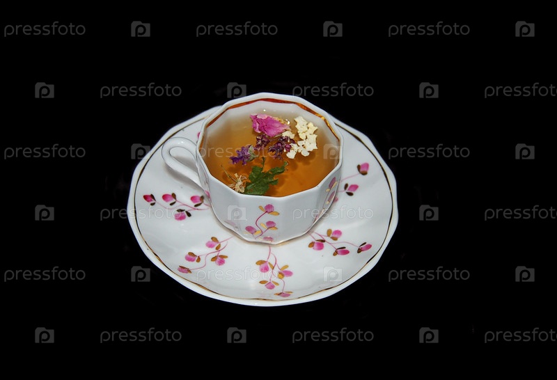 Цветочный чай в фарфоровой чашке на черном фоне