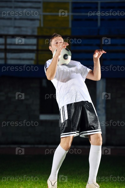 Футболист с мячом на стадионе, ночь
