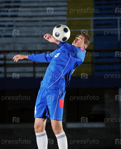 Футболист с мячом на стадионе, ночь
