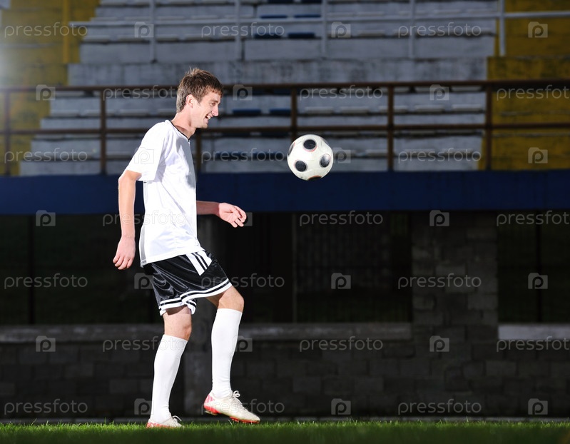Футболист с мячом на стадионе, ночь