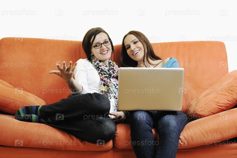 Две девушки сидят с ноутбуком на диване