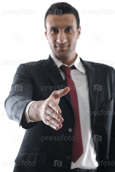 Бизнесмен протягивает руку на белом фоне