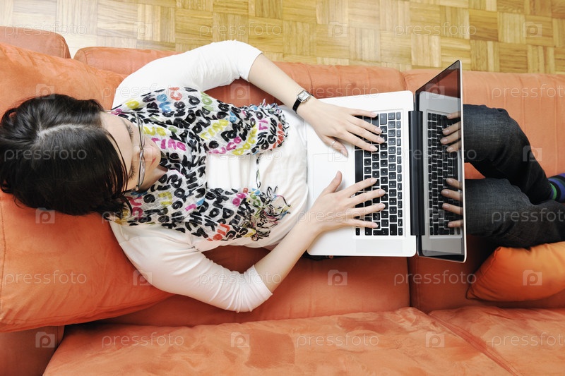 Деловая леди в повседневной одежде работает на ноутбуке на оранжевом диване