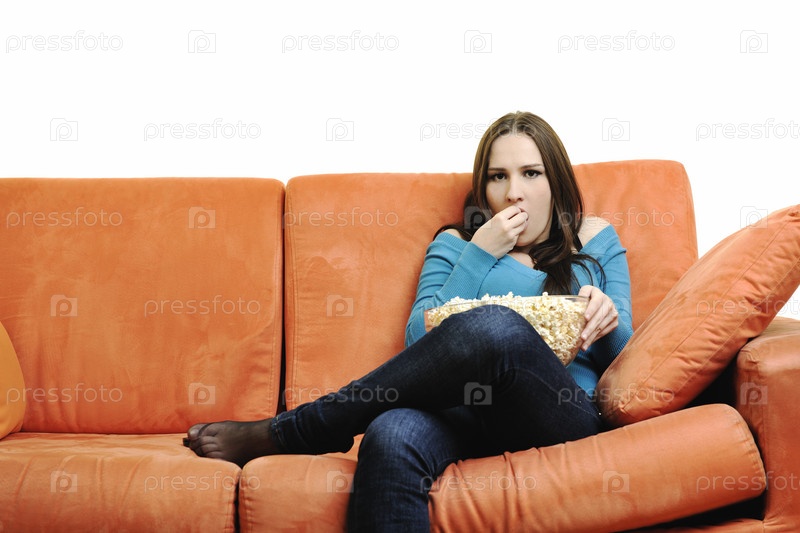 Молодая женщина ест попкорн и смотрит телевизор, изолирована на белом фоне