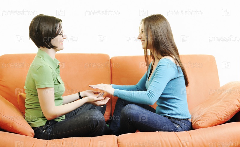 Две девушки сидят на диване