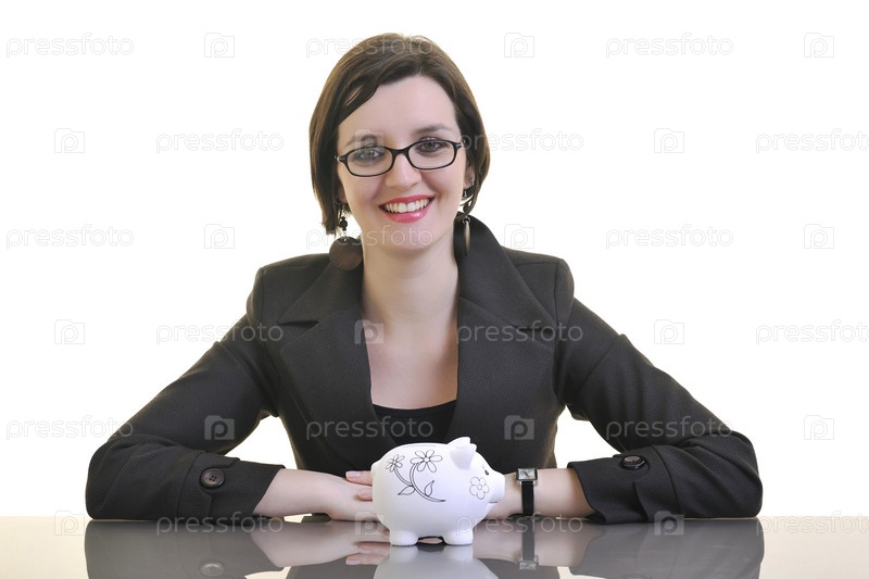 Портрет молодой деловой женщины с копилкой