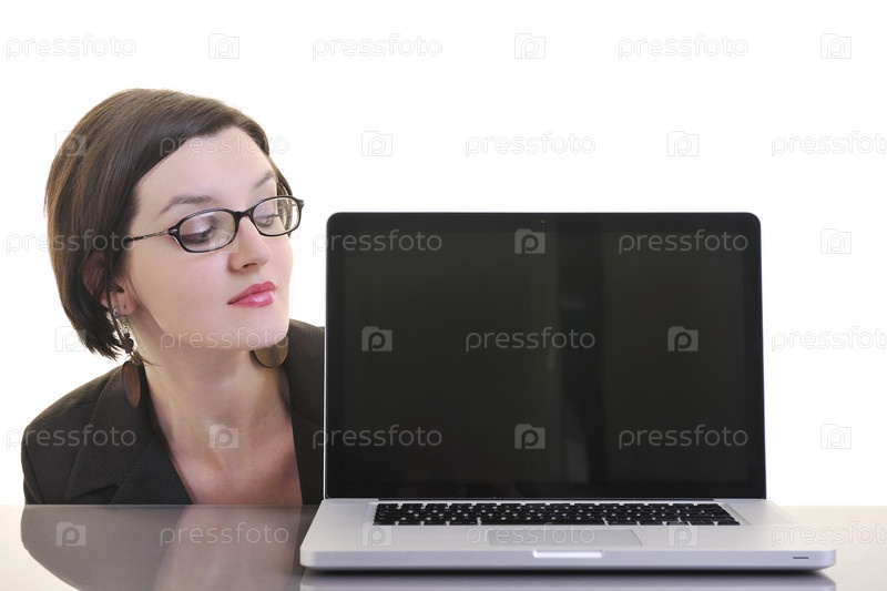 Деловая молодая женщина с ноутбуком на белом фоне