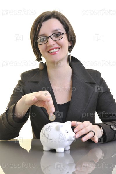 Портрет молодой деловой женщины с копилкой