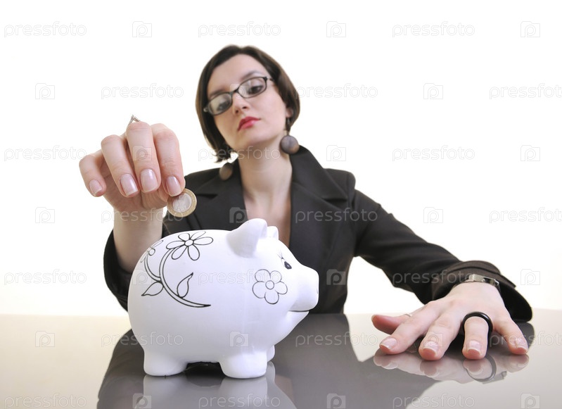 Портрет молодой деловой женщины с копилкой