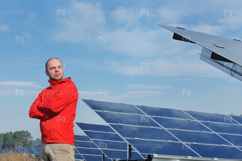 Молодой инженер на фоне солнечных панелей, вырабатывающих электричество