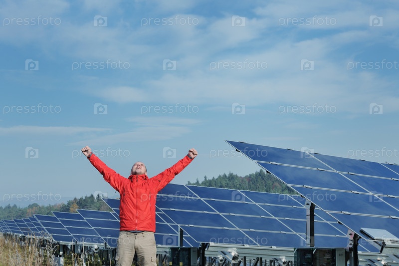 Молодой инженер на фоне солнечных панелей, вырабатывающих электричество
