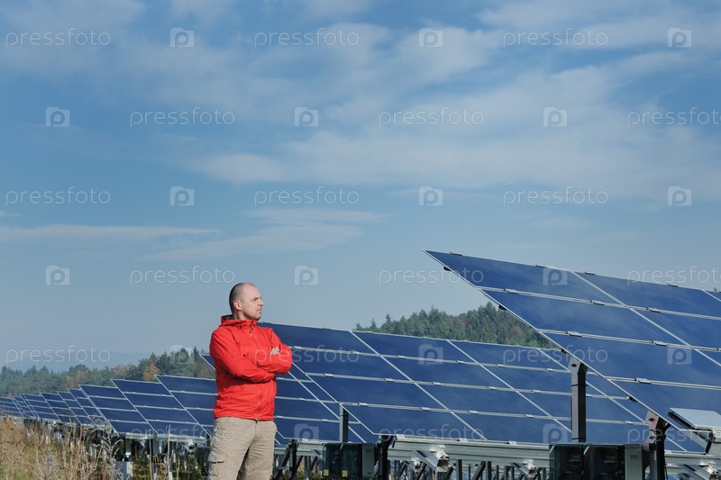 Молодой инженер на фоне солнечных панелей, вырабатывающих электричество