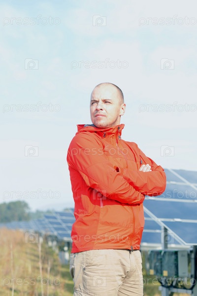 Молодой инженер на фоне солнечных панелей, вырабатывающих электричество