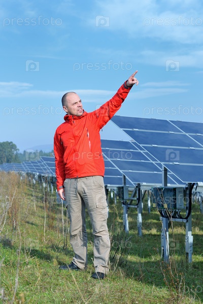 Инженер на фоне солнечных панелей, вырабатывающих энергию