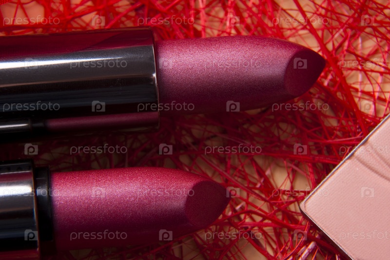 Две помады и порошок на красном фоне
