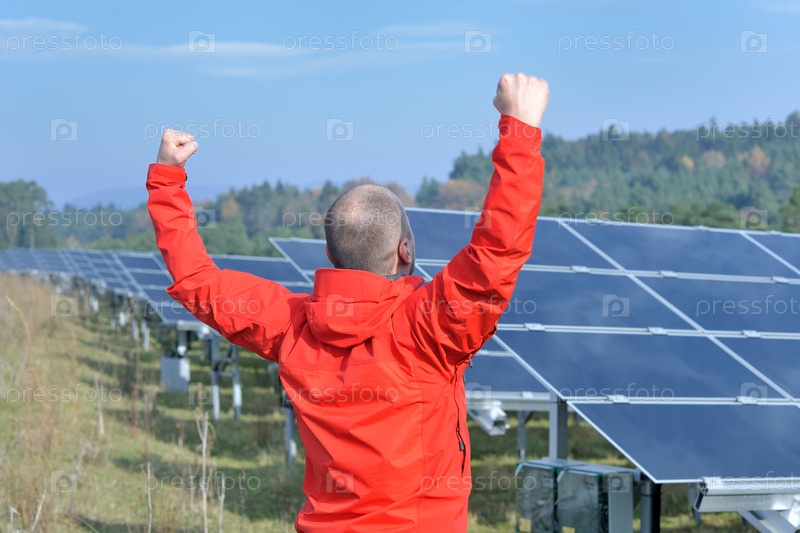 Инженер на фоне солнечных панелей, вырабатывающих энергию
