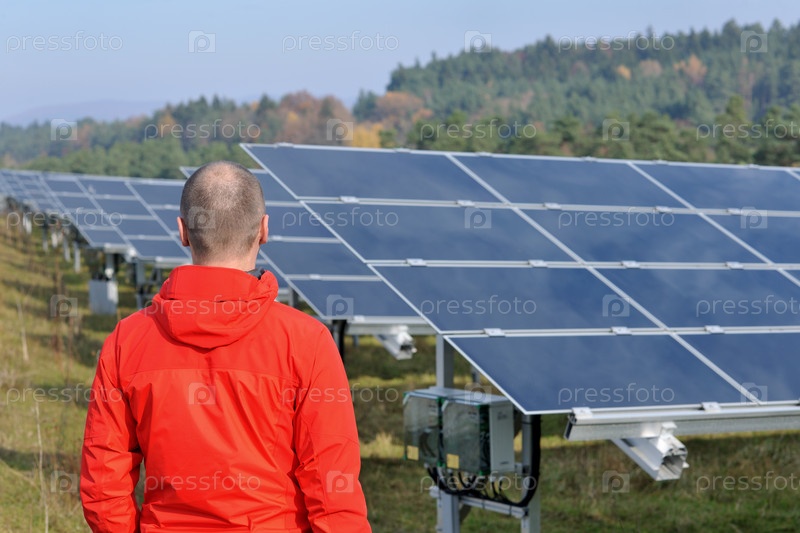 Инженер на фоне солнечных панелей, вырабатывающих электроэнергию