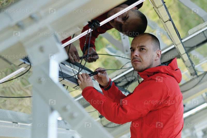 Молодой инженер проверяет исправность работы солнечных панелей
