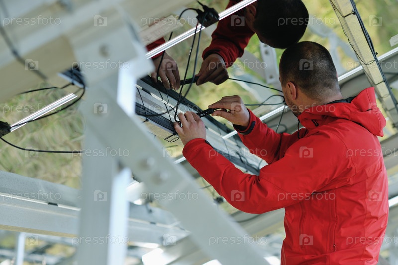 Молодой инженер проверяет исправность работы солнечных панелей